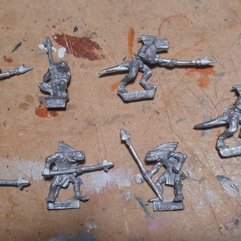21kpl Warhammer Fantasy Battle Lizardman Saurus Warriors ja 20kpl Skink figuureita. Isolta osalta Saurus Warrioreilta puuttuu kilvet. Neljältä skinkiltä puuttuu toinen käsi ja kaksi katkenneet jaloista.
