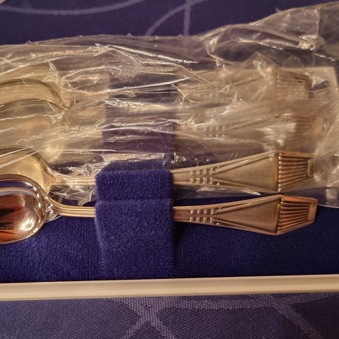 Käyttämättömät Akseli Gallen-Kallelan Auomi-sarjan hopeiset (830) kahvilusikat (6kpl) pakkauksessa.