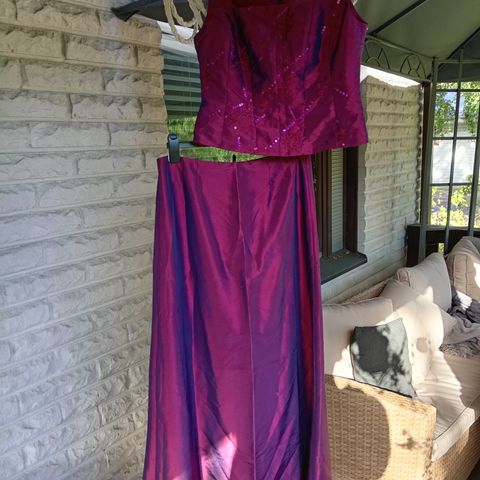 Kaksiosainen Chou Chou-merkkinen iltapuku, pitkä hame ja korsetti-yläosa, molemmissa takana vetoketju. Väri elää liikkeessä ja eri valossa, viininpunainen/violetti.