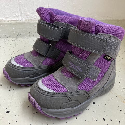 Laadukkaat ja toimivat vedenpitävät talvikengät, lämmin vuori, melko kevyt malli, sopivat loskakelistä pakkasiin. Sopivat keveytensä puolesta mainiosti myös kevät- ja syyskengiksi ja pitävät vettä, vaikka lapsi hyppelisi vesilammikoissa :) Nauhojen alla on yhtenäinen varsiosa, lumi ja vesi eivät pääse kenkään sisälle. Malli Superfit Husky.