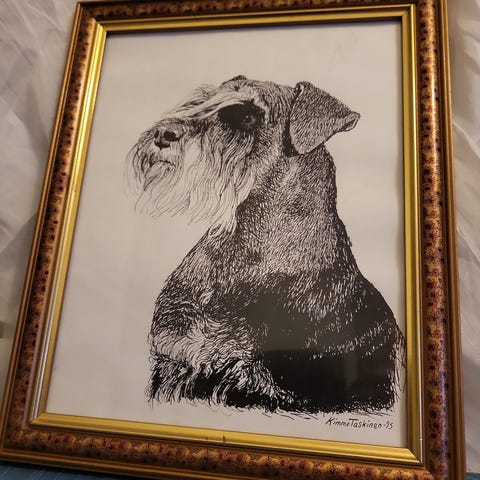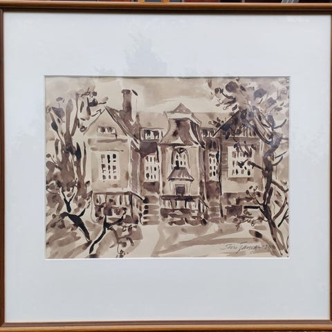 Sissi Korhosen vedos 4/12 "Kotitalo" vuodelta 1994. Työn korkeus on 12 cm ja leveys 15 cm. Kehys 35 X 37 cm.