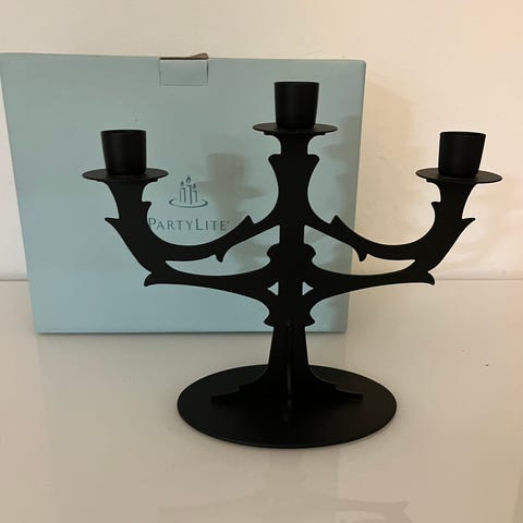 Metallinen kynttilänjalka neljälle tuikulle tai kynttilälle. Tuikkukupit lasia.