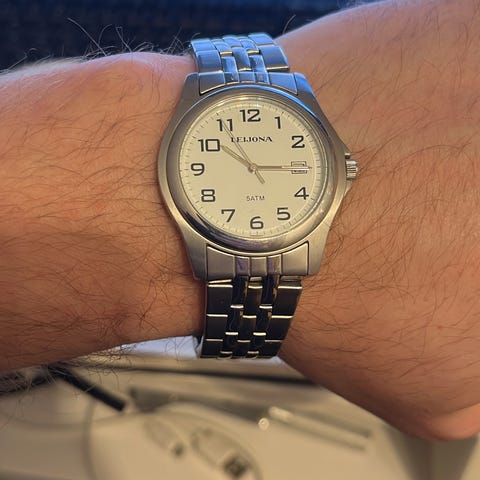 Leijona miesten rannekello, jossa musta kellotaulu ja musta nahkaranneke. Kaupan päälle kaksi One-merkkistä kelloa. Patterit on loppu.