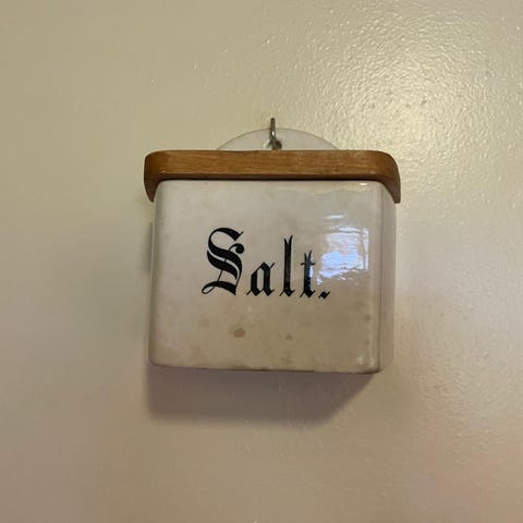 Arabian seinään laitettava suola-astia. Mitat 14,5x13,5x11. Kulkeutuu tarvittaessa Hämeenlinnasta Lapuan ja Helsingin suuntiin. Retro.