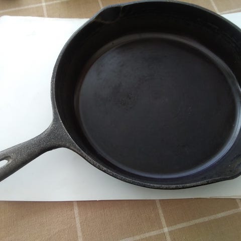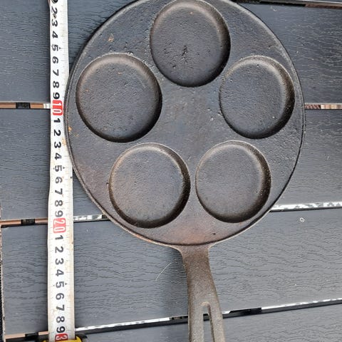 Valurautainen paistinpannu. Pohjan halkaisija n. 14 cm ja halkaisija reunan yläosasta n. 21,5 cm. Reunan korkeus n. 5 cm.