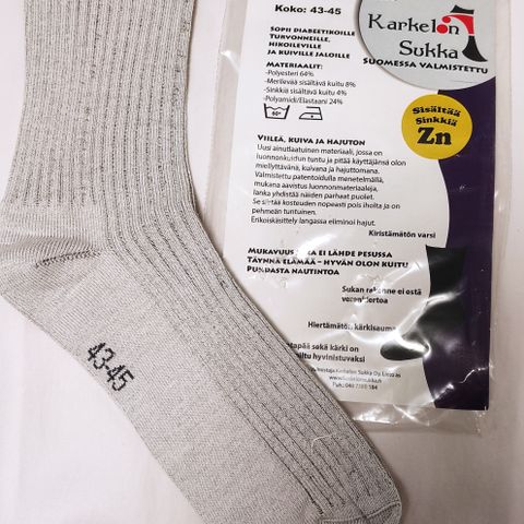 Kuvassa vasemmalla 2 paria Karkelon sukat, kiristämätön, hyvänolon sukka, vaalean harmaat sis. merilevää ja sinkkiä, koko 43-45