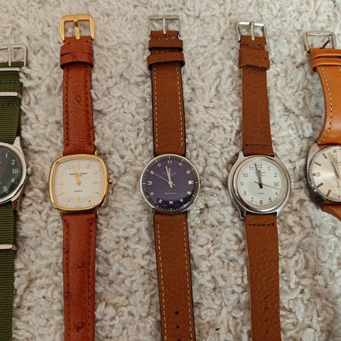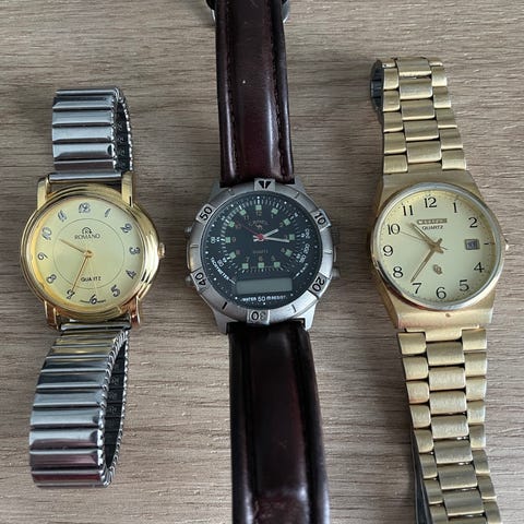 Kello on käytetty mutta toimiva, näyttäisi pitävän aikaa parin päivän seurannalla. Ulkoisesti näkyy normaaleja käytönjälkiä rungossa ja rannekkeessa, mutta kokonaisuus on siisti ja vintage-henkinen.