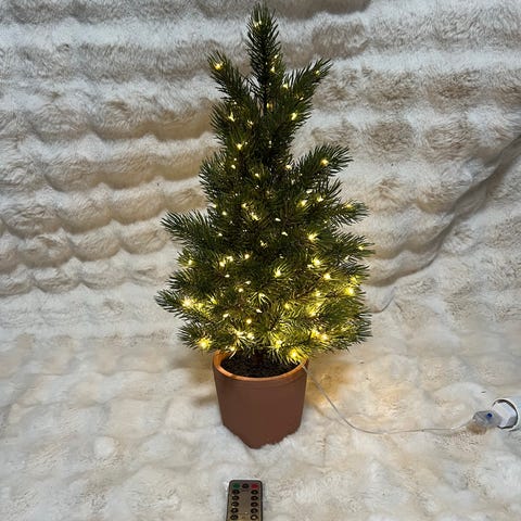 Pieni (joulu)kuusi jalustalla, valoilla ja koristeilla. Tummanvihreä, taivuteltavat oksat, nelijalkainen teline. Valosarja 10 lamppua (kaikki toimivat) + kaksi ylimääräistä käyttämätöntä lamppua sekä työkalu helppoon lamppujen vaihtamiseen. Punaisia silkkipalloja kolme pientä, kuusi isompaa, hopeinen olkitähti ja hopeanauhaa. Nätti kausivalonakin pelkällä valosarjalla ilman koristeita tuomaan valoa pimeyteen. Kompakti ja kevyt, kaikki tarvikkeet mahtuvat yhteen sutjakkaan laatikkoon (helppo säilyttää, ei juurikaan vie tilaa). Turvallinen esim. lemmikkien kanssa. Toridiilipakettina pitää ottaa mittojen puolesta isohko ja hintava paketti, toimitus toisella tapaa / omien reittien varrelle edullisemmin tai maksutta. Kissatalous.