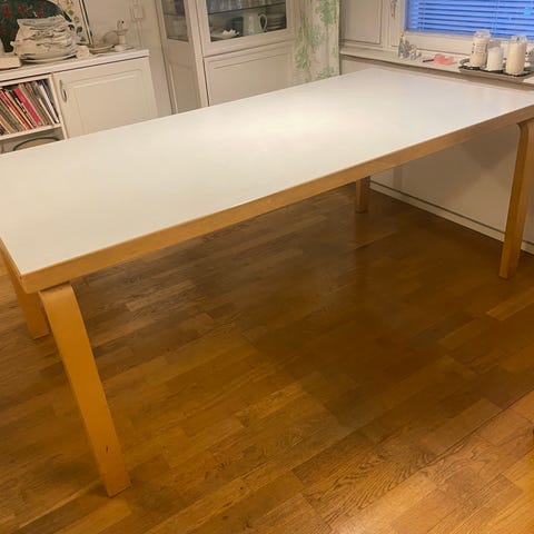 Artek Alvar Aalto ruokapöytä 84, 120 x 120 cm, koivu & valkoinen. Pöydän pinnassa on vähän käytön jälkiä, kuten naarmuja, jotka näkyvät kuvissa.