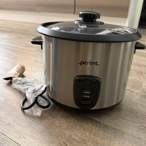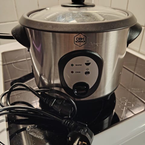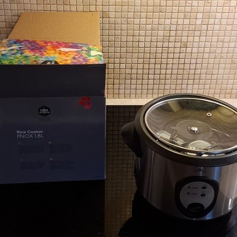 OBH Nordica Rice Cooker 1800 keittokulho, valkoinen väri, sisältää lasikannen ja irrotettavan sisäastian. Sähkökäyttöinen laite riisin keittämiseen ja muuhun ruoanlaittoon.