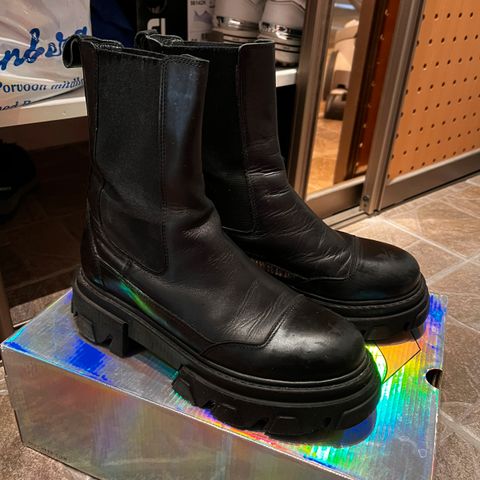 Käyttämättömät nahkasaapikkaat, platform noin 2 cm, korko n.10 cm. Saapikkaan korkeus kannasta varren yläreunaan n.49 cm.