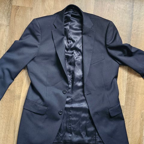Puku on ollut käytössä yhden kerran pojan rippipukuna. Käyttäjä oli noin 180 cm pitkä ja hoikkarakenteinen. Puku on siisti ja hyväkuntoinen.