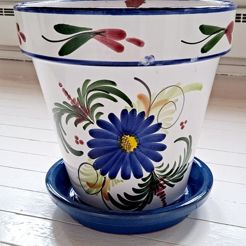 Kaunis saviruukku, jossa koristekuvio. Kunto hyvä. Sininen aluslautanen sisältyy hintaan. Mitat: halk. 16 cm ja kork. 16 cm. Katso myös myynnissä olevat isommat ruukut. Ainoastaan nouto Pukkilasta.