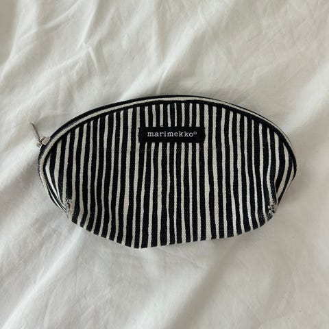 Marimekko Sateenkaaret Valamonruusut pussukka/kosmetiikkalaukku, 13x24x8cm, sininen/musta/valkoinen, käytetty, siisti ja ehjä.