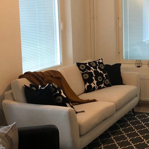 Myydän Furninovan Noir malliston 2,5 istuttava divaanisohva. Pehmusteet vaahtomuovia sekä höyhen pinnassa. Sohva on hyvässä kunnossa. Divaaniosa on leveämpää mallia, eli tässä mahtuu hyvin ottamaan päiväunet. Pääosin sohvassa on ollut peittoja päällä käytettäessä. Noir on Furninovan moduulisohvien mallistoa, eli tässä tapauksessa menee kahteen osaan, pohjassa massiivitammilistat, joista tulee mukavasti näköä. Jalat harjattua terästä, vapaa korkeus sohvan alla noin 20cm. Istuinosat ovat kiinteät, selkänojan tyynyt irralliset ja niiden päälliset irralliset ja pestävät. Sohva on pesty tekstiillipesurilla, jonka jälkeen ei ole käytetty. Koiratalous.