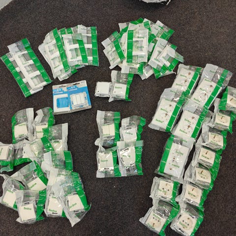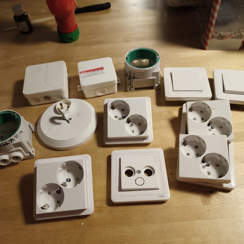 Kuvan sähkötarvikkeet. Käytön jälkiä löytyy eikä peitelevyjä kahteen.