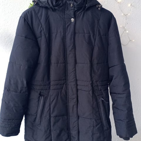 Kuvien mukainen tosi lämmin takki karvareunushupulla. Juuri pesty. Huppu kiinni takissa vetoketjulla. Hupun karvan saa myös irti. Väri on tummansininen. Ei kirkas, niin kuin joissakin kuvissa. Mitat olka-helma 85 cm. Kai- kai 60 cm. Hiha olalta mitattuna 65 cm.