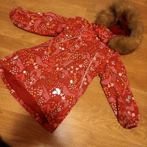 Hyväkuntoinen Reimatec toppatakki. Neljä taskua, joista yksi hihassa ja yksi povitasku vuoren sisäpuolella. Vyön kohdalla erillinen lumulukko. Takissa myös kiinnikkeet hupparille, mutta huppari ei ole mukana.