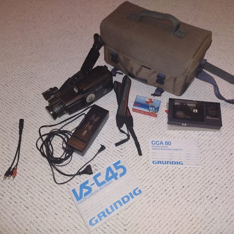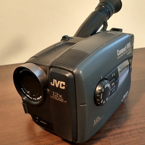 Toimiva JVC Compact VHS -videokamera mustassa värissä. Mukana tulee kantohihna.