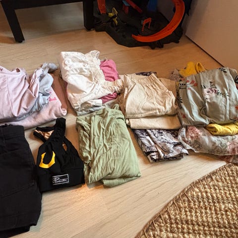 Hyväkuntoisia vaatteita, pari 146cm. Vaaleanpunaisessa paidassa nukkaa, muut paremmassa kunnossa. Ei eläimiä tai tupakointia. Nouto Mälikkälästä.