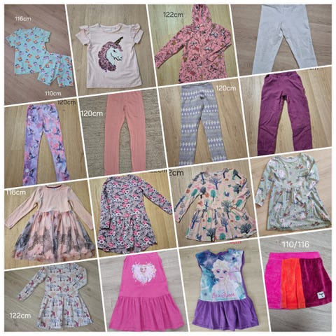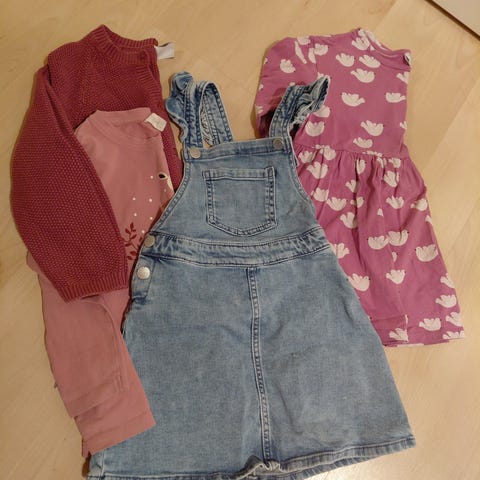 Tässä kattavassa paketissa löytyy 9kpl housut, 2kpl samettihousut, 3kpl yökkäri, 1kpl jumpsuit, 1kpl shortsit, 12kpl paitoja, 2kpl mekkoja. On tsi, molo, esprit, lindex ym.