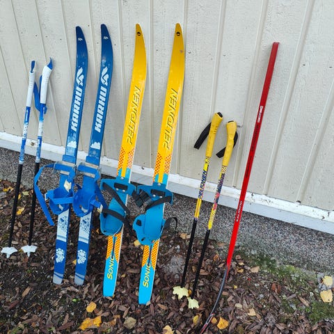 Tästä sukset seuraavalle. 120cm. Pohjasta löytyy jälkiä ja toisen suksen takapäästä puuttuu pala luistopintaa. Ei haittaa menoa. Siteet täysin ehjät.