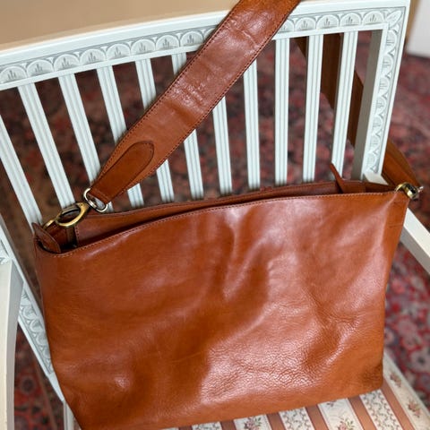 O My Bag " Little Frankie" camel nahkalaukku. Unisex. Leveys 33 cm, korkeus 27 cm. Paljon pidetty ja patinoitunut. Kuitenkin vielä hyvässä kunnossa.