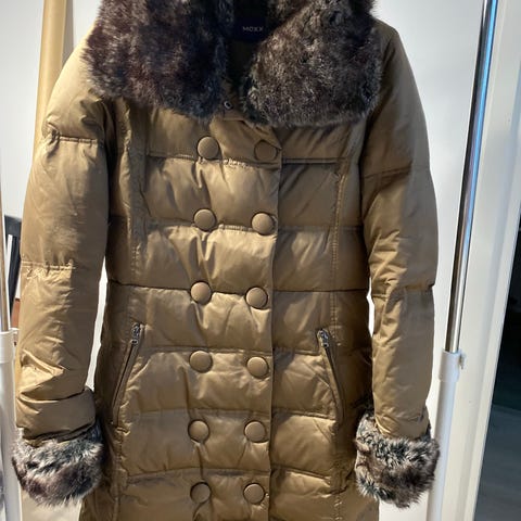 Erittäin siisti, lämmin ja laadukas MEXX talvitakki. Väri suklaan ruskea, kiiltävä pinta. Tyköistuva. Edessä vetoketju ja napitus, vetoketjulliset taskut. Huppu irroitettava. Kai-kai mitta noin 56cm, pituus hartiasta helmaan 94cm.