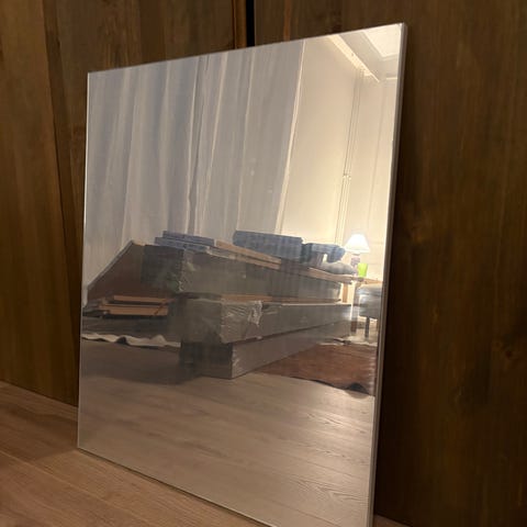 Kuvan mukainen peili. Peilissä kaksi eri vahvuutta. Säätyy vieterillä ja seinään kiinnitettävällä akselilla haluttuun kohtaan helposti.