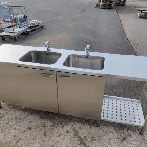 Käytetty Rst-tiskipöytä kahdella altaalla ja Oraksen hanalla. 220 cm x 62 cm, säädettävät jalat.