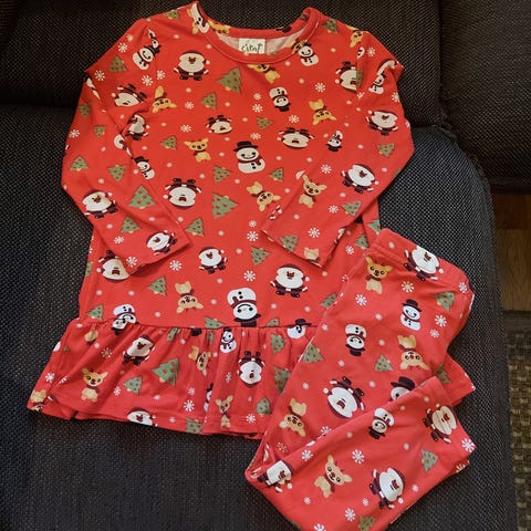 Trikoota. Mekko, housut ja tonttulakki. Pesuhaitua jonkin verran tummissa kohdissa, huomioitu hinnassa.