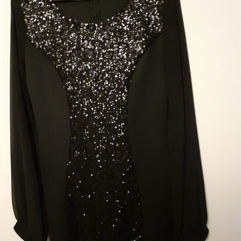 Housen musta glitterpaita. Materiaali kevyttä ja joustavaa. M-koko, mutta vastaa enemmän L-kokoa.