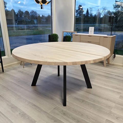 Pohjanmaan kalusteen Sandvik pyöreä ruokailuryhmä, jossa pöytä on 140cm leveä ja mukana tulee 6kpl Sandvik tuoleja.