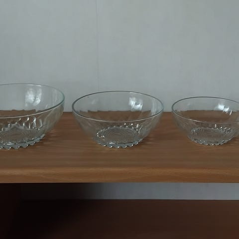 Kolme lasikulhoa, ehjiä, siistejä, kaksi samanlaista 13x6,5 cm ja yksi 14x7 cm. Sopii vaikka karkkikulhoiksi joulupöytään tms. 2 € / kpl tai jos otat kaikki niin 5 €.