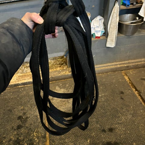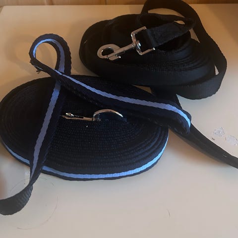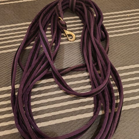 Pitkä hevosen juoksutusliina. Alkuperäinen lukko mennyt rikki ja se korvattu toisella lukolla, mutta muuten hyväkuntoinen ja ehjä.