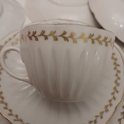 5 kpl Arabian Keiju sarjan kahvikuppeja,6 kpl aluslautasia halkaisija 13,5 cm, 6 kpl pullalautasia halkaisija 16,5 cm, 1kpl tarjoilulautanen halkaisija 26 cm, kermakko. Yhdessä pullalautasessa pieni kolhu pohjassa ja kermakossa myös, kuvissa näkyy. Myyn kaikki yhdessä. Vain nouto.
