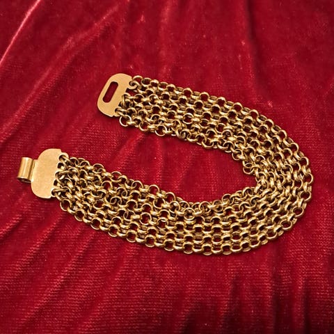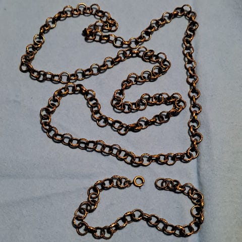 80cm pituinen ja 11mm levyinen näyttävä pronssikääty, jossa vuorottelevat neljä koristeellista ja neljä sileää rengasta, 40€.