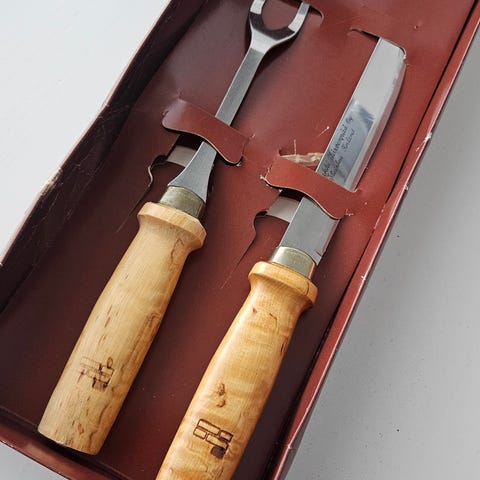 Myydään kuvan mukainen Iisakki Järvenpään Peijais-setti, johon kuuluu veitsi ja haarukka. Käyttämätön. Tarjousten perusteella. Laatikon läpinäkyvä suojakuori rikki. Mahdolliset postikulut ostajalle.