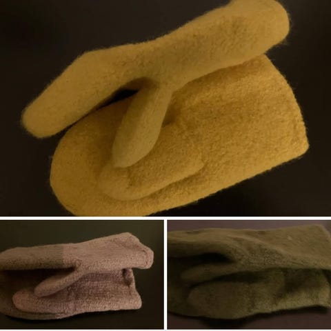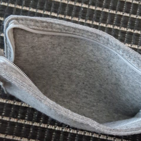 Itse ommellut, ekaa kertaa huopaa. 3mm harmaa huopa ja sininen vetoketju 20 cm.