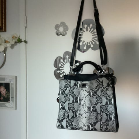 Tyylikäs musta yksinkertainen tekonahkalaukku, hihna säädettävissä. Sisällä kaksi lokeroa, toinen vetoketjulla suljettavissa, myös pienempi vetoketjullinen sisätasku. Kerran käytetty.