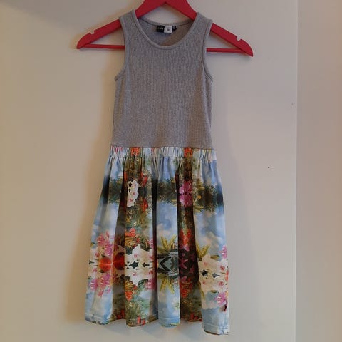 Uutta vastaava Molo Christabelle-mekko ihanalla kirjavalla kuosilla ja röyhelökoristeella. lasten mekko, koko 146/152cm.