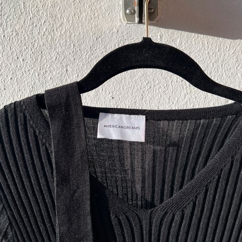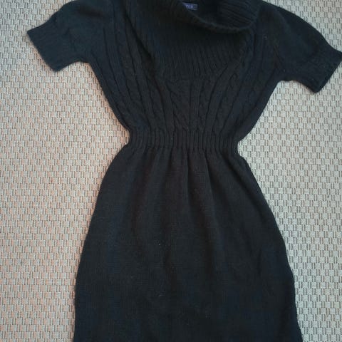 Väri on tummanharmaa. Poolokaulus, hihatonta ja sivuissa on pitkät halkiot. Mitat: kainalo-kainalo 48 cm ja pituus 105 cm.