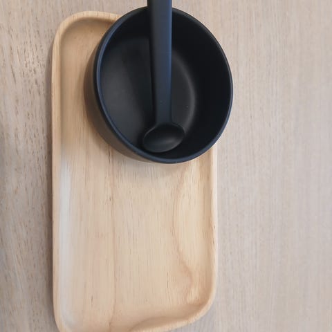 Marimekko Hetkia Moments -sarjan pienet tarjottimet ja muki. Sarjan suunnittelija on Maija Louekari, valmistusvuosi 2003.