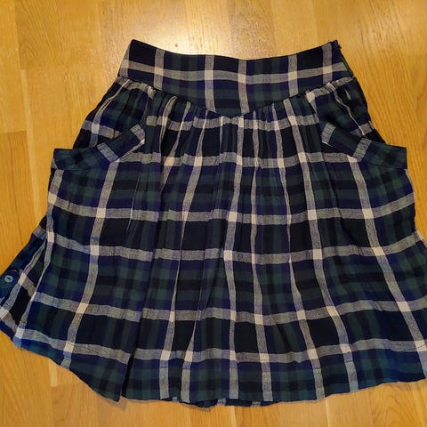 Vintage ruutuhame Malli Mari Finland. Sivussa vetoketju ja nappi. Vyötärön ympärys 68 cm. Pituus 71.