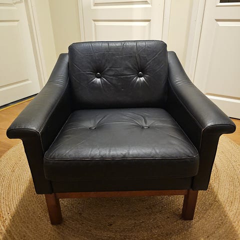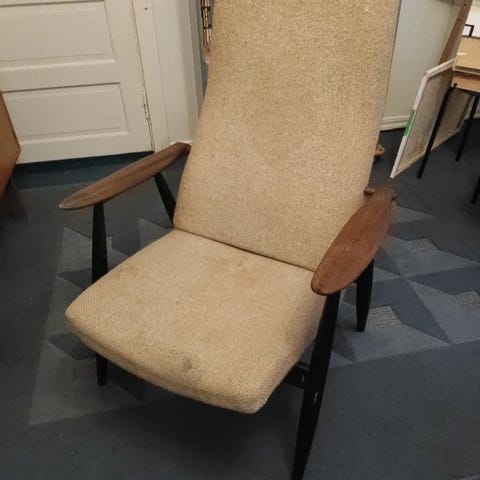 Askon 50-luvun lepotuolit, "Asko Koti 2407", vähän käytetyt, jousitus napakka. Alkuperäiset " päätyynyt" poistettu, niiden kohdalla selkänojan kankaassa pientä värjäymää (kuva2 2), ei ole yritetty poistaa.