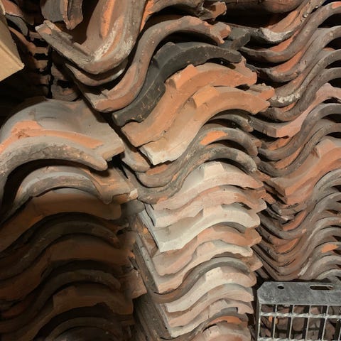 Punaisia käytöstä poistettuja kattotiiliä, enemmän ja vähemmän rikkinäisiä.