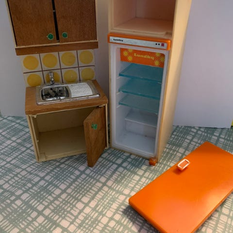 Lundby keittiö oranssilla jääkaapin ovella ja keltaisilla "kaakeleilla"
