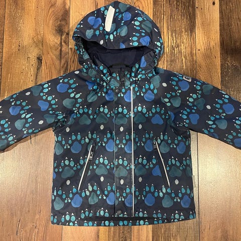 Reiman Trivor harmaa takki ja mustat housut koossa 98. Tikatun näköinen pinta ja raidalliset resorit kauluksessa, hihan ja lahkeensuissa. Muutama nukanhaituva näkyy resoreissa, mutta muuten oikein hyvässä kunnossa molemmat. Sopii hyvin välikerrokseksi.