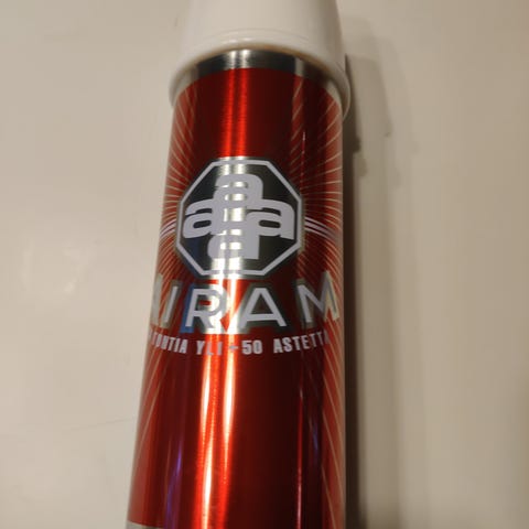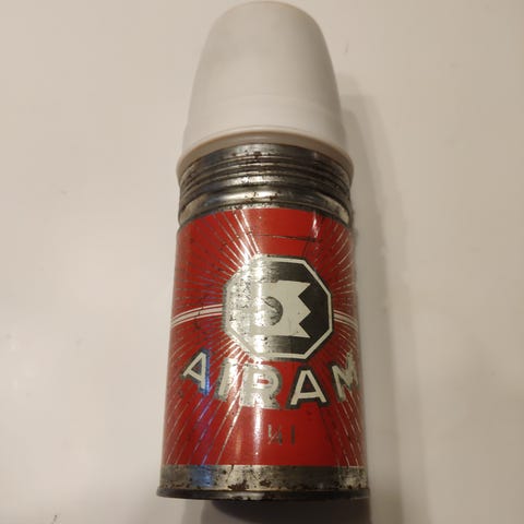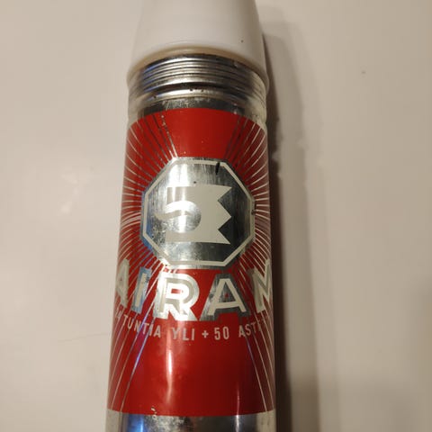Airam termari / termospullo. Tilavuus 1 litra. Korkeus 31 cm. Ulkoa suht siisti, muutama pieni ruostepiste. Sisällä värjäymää.