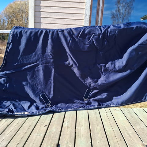 Sininen, (ehkä) 350g.Lämmin, vaikkei pullea. Kestävä. Puuvillavuori on sähköiskuvapaa.